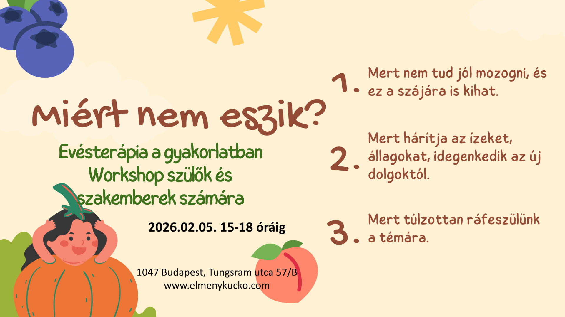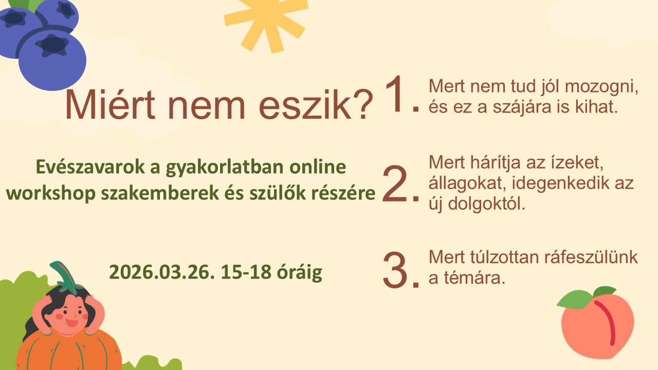 Szeretettel várjuk az evésterápiával kapcsolatban érdeklődőket egy 3 órás, elméleti és gyakorlati ismereteket nyújtó workshopon 2026. február 5-én 15-18 óráig az Élménykuckó korai fejlesztő szervezésében.